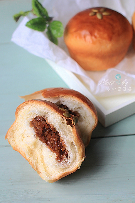 这个面包是根据其实是中种北海道面包+红糖糯米馅,一西一中,却混搭出别样的好滋味。我带到单位,同事MM挖了糯米舔着手指说,实在太好吃了,这个馅儿给我单吃一碗也不够的,确实如此。