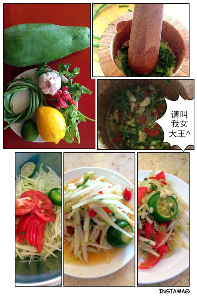 鉴于朋们的热烈响应,和各种求做的方法,今天做的时候特意拍照了,不过辣度没掌握好,辣椒放多了,辣倒了一片人[呲牙][发呆]这是我家乡西双版纳的路边小食,“青木瓜沙拉”准备所有的材料后,先把番茄切片等会用,青木瓜削皮后切丝,再用冰水泡着,然后将大蒜,豇豆,小米辣、香菜捣碎,然后放柠檬,朗姆,盐,糖,鱼露,酱油和味精做成酱汁放到沥干水的青木瓜丝里,拌开,装盘,最后再把捣碎的花生米洒进去,一道泰国风味十足的青木瓜沙拉就完成啦[得意][得意](以上所有材料都能在“万能的淘宝”上购买)[愉快][愉快]
