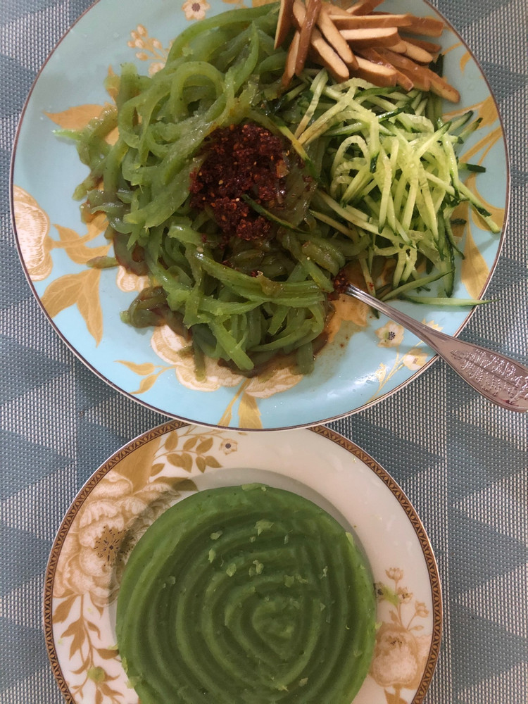因为疫情宅在家里,家里有豌豆粉,按照一比五的比例,一碗豌豆粉五碗水。步骤:1、豌豆粉用水拌开成糊状;2、锅里倒入五碗水;3、把糊状的豌豆粉倒入锅中顺着一个方向搅拌;4、凉水开始倒哦;5、搅拌到变成透明质的并且起泡;6、倒入碗里定型;7、吃的时候加点芥末、盐、醋、酱油、黄瓜丝、豆干丝、辣椒油、香油,好吃的嘞。