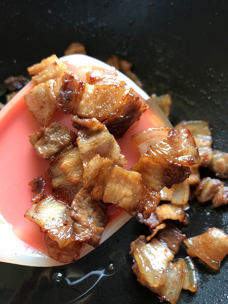 五花肉切薄薄的,锅里放一点点油煎一下,两面金黄撒上一点味事达,棒