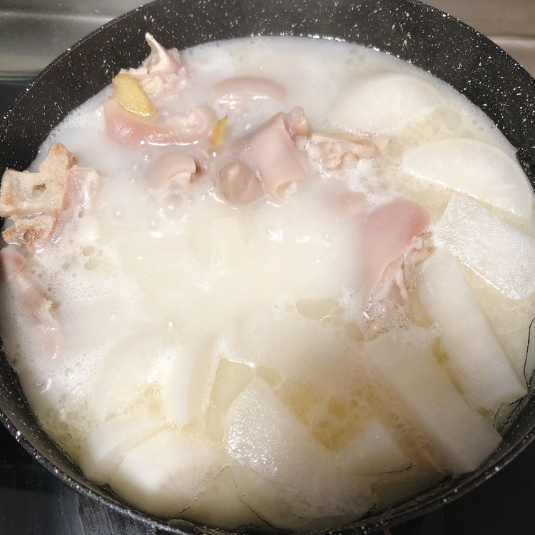 > 猪蹄小火炖了一个半小时,汤汁收白加白萝卜煮熟,好吃~孕妇的晚餐