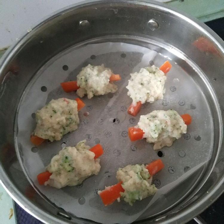 鸡胸肉,虾,蛋清,西兰花(焯水),三勺米粉,一勺面粉,加虾皮粉、宝宝酱油,搅拌均匀,胡萝卜(也可以用土豆)切长条,把糊裹在胡萝卜上面,上锅蒸熟即可。