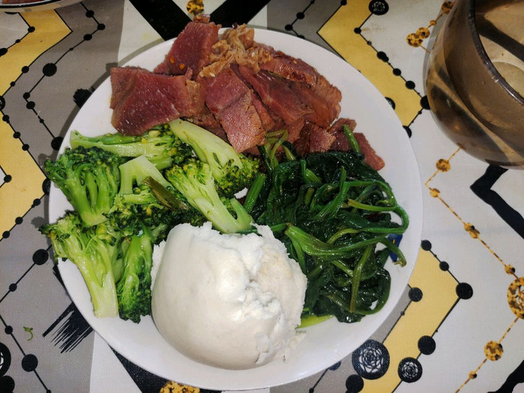 > 大拌菜+牛肉+西蓝花+菠菜+馒头