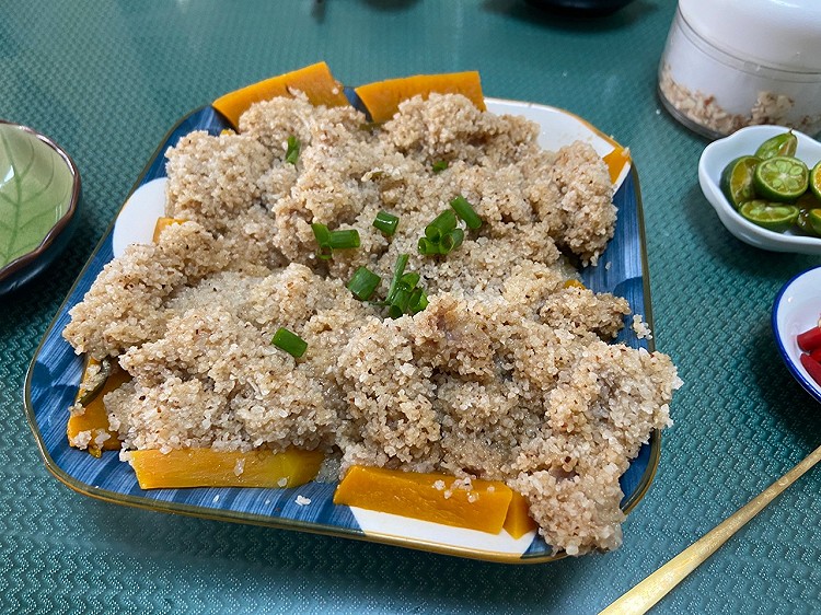 > 第一次做 可以说 肥肠成功 没用排骨 拿带皮得上肉做的 一样腌一腌之后把粉加水搅豁一下 裹起来 然后满满当当地码到南瓜上 嗯 阔以👍