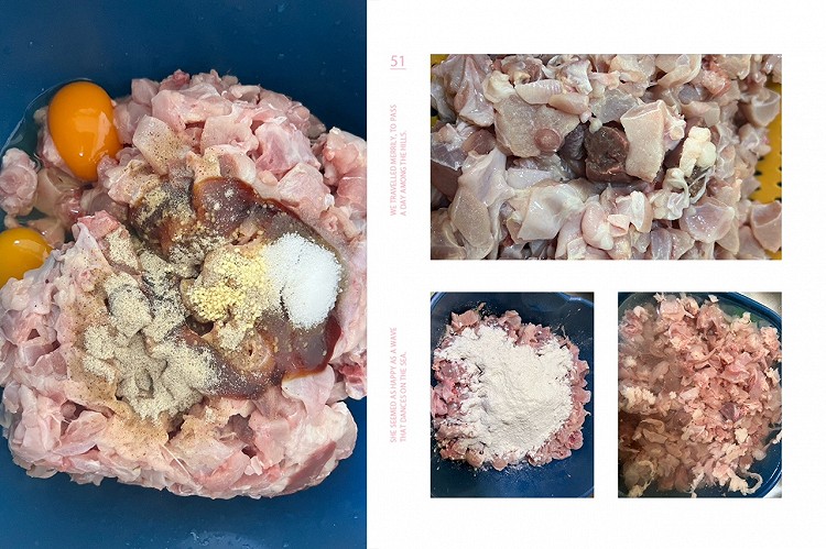 5⃣️在兔肉中加入料酒、蚝油、白酒、鸡精、鸡蛋、盐、胡椒粉、葱姜水腌制30分钟
