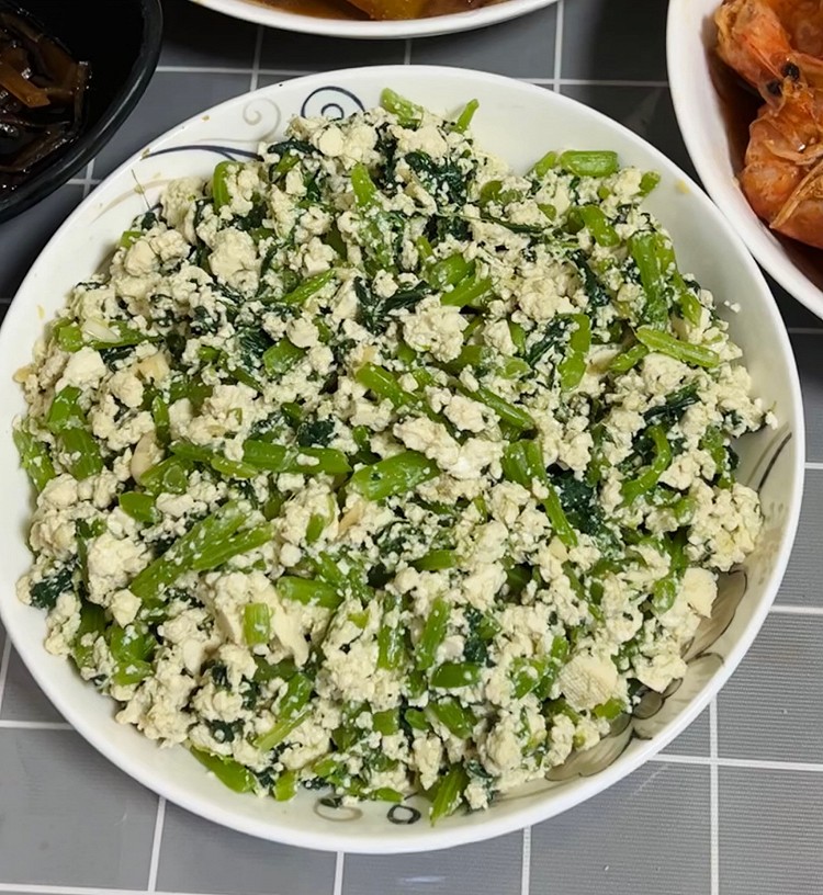 茼蒿 焯水煮熟捞出,凉凉攥干水分, 豆腐锅开水去除豆腥味,捞出等放凉, 蒜泥,味极鲜或者生抽,少量醋,盐,香油,要是有花椒油,可以点一点点,绝了