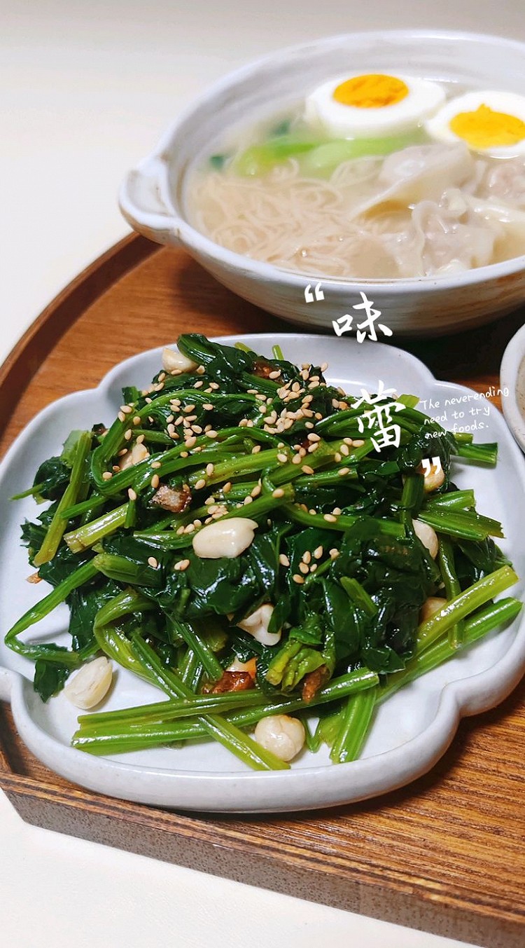 > 云吞面,萝卜馅肉包子,菠菜花生米